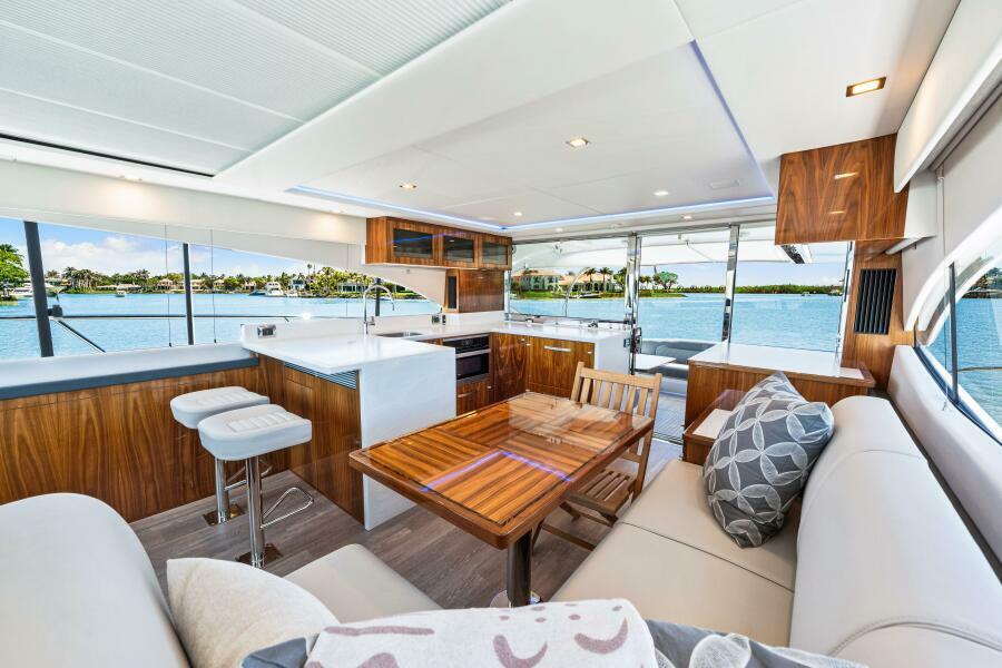Great design makes every area of the 5400 Platinum Edition shine. Consider the ideally positioned galley. Simply open the ship-like bulkhead door and aft-facing awning window to position the chef at one with the interconnected saloon and alfresco cockpit activity. Trading