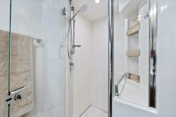 You notice design highlights everywhere onboard. Taking the companionway steps down from the saloon you look up and the soaring glass atrium above lifts your spirits and fills this whole area with light. The master stateroom below is elegant and regally sized, luxuriating across the full beam. Private and self-contained it boasts spectacular views to both port and starboard. The island bed is king-sized and supremely comfortable and matching bedside tables highlight the space on offer. There is even room for a private chaise lounge to starboard. Deep plush pile carpet and fabulous timber cabinetry for storage including his and hers cedar-lined hanging lockers, speak of a rare luxury. There is no finer place to settle back and enjoy your world class, fully integrated home theatre system.