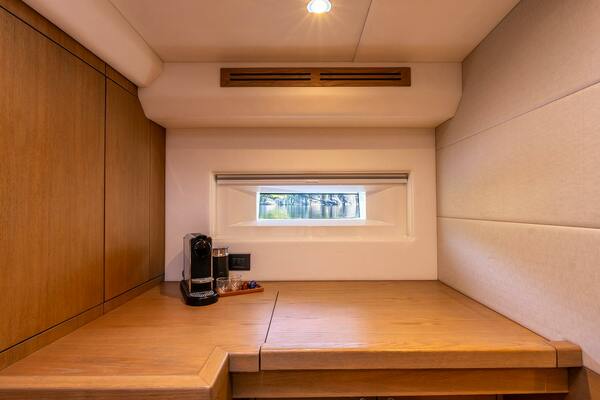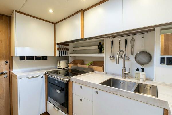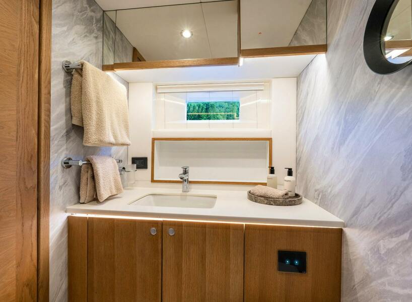 Inside, her modern, fresh interior features wraparound deck saloon windows that provide panoramic views. The salon is finished in fine wood tones and light cream fabrics. The port-side dining area comfortably seats eight, while the forward-facing navigation station to starboard is ideally positioned for easy access to controls. The fully equipped galley features white-grey marble countertops, a Miele induction hob and electric oven, and top-tier appliances, ensuring effortless meal preparation whether at anchor or underway.