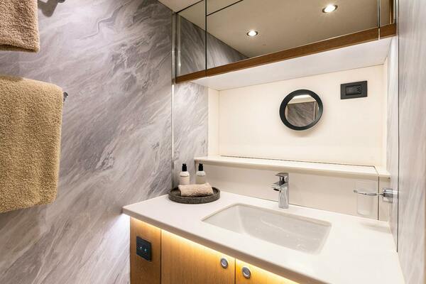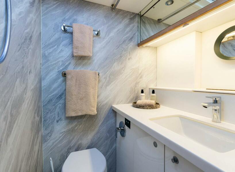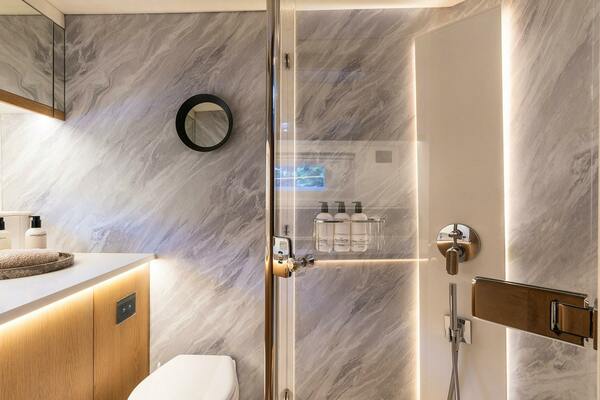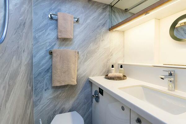 Large double guest cabin ahead and to starboard of master. Twin guest ahead of master to port. Large, oversized guest cabin ahead of saloon to starboard side. All guest cabins feature ensuite bathrooms.